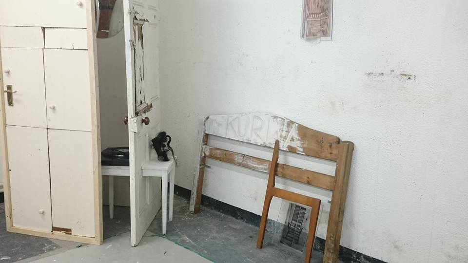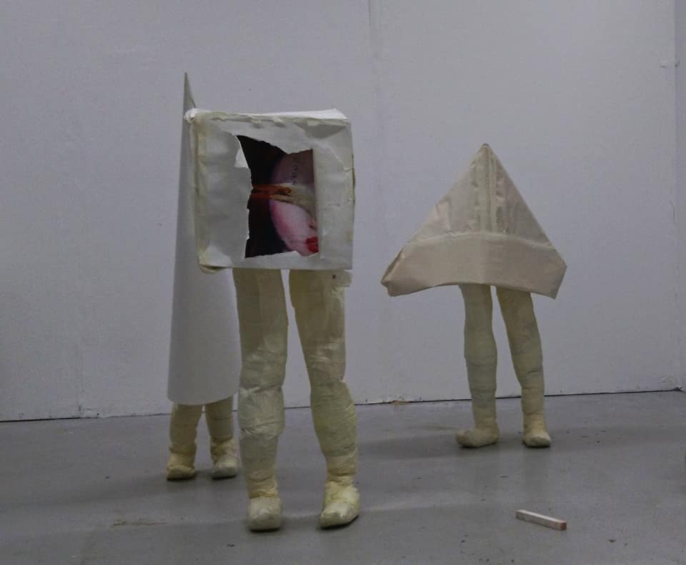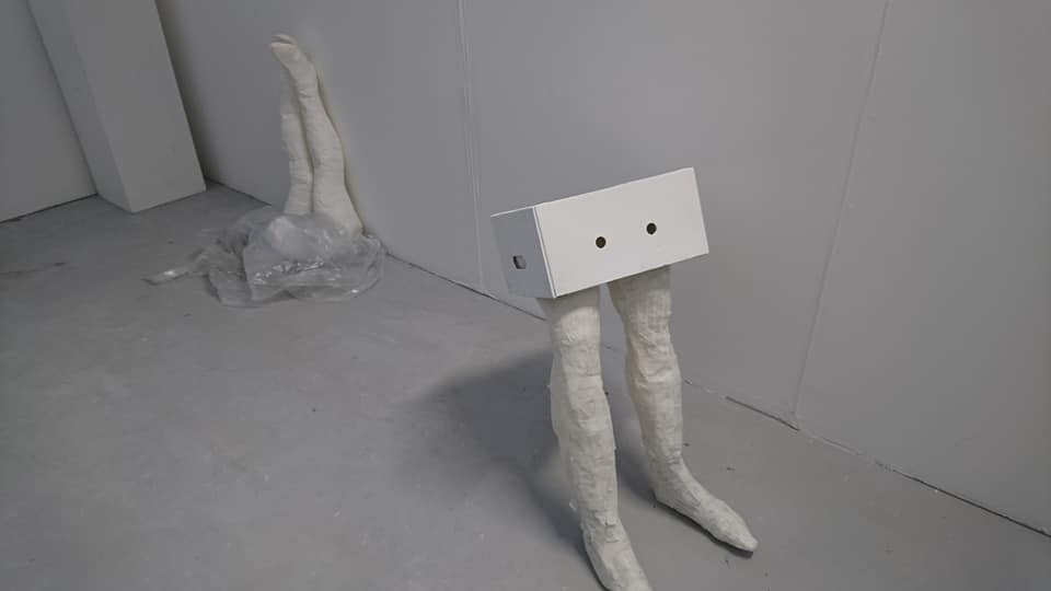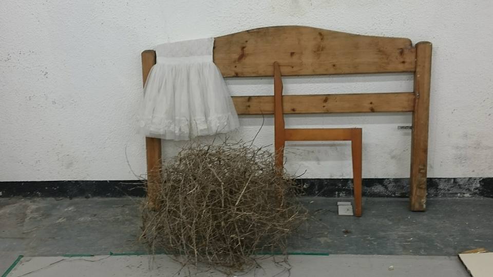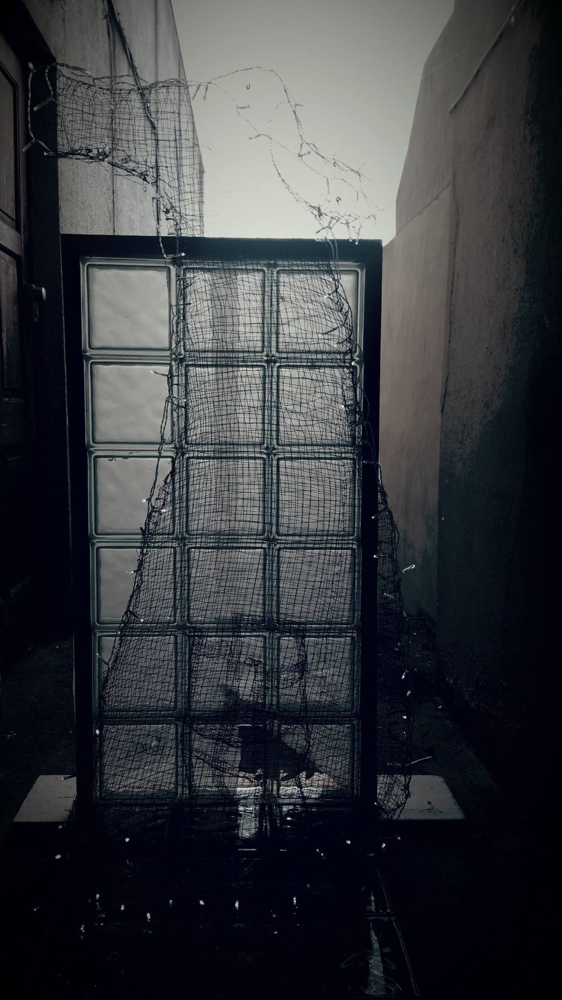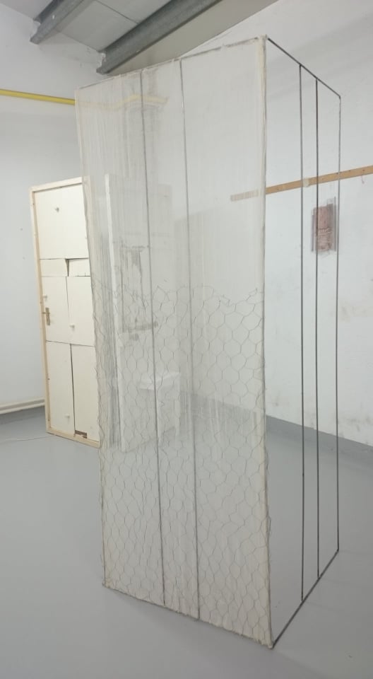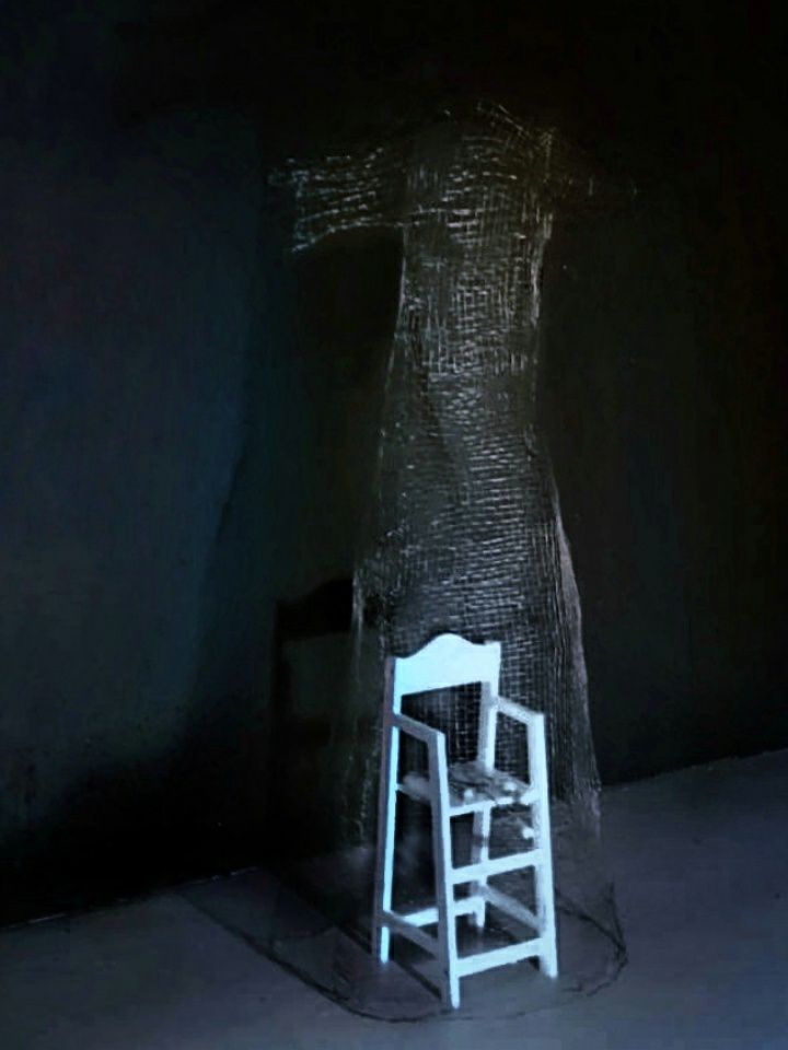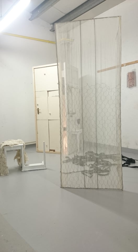 Instalation, found objects, metal wire, hessian, rubber, fleeces, blue light projection