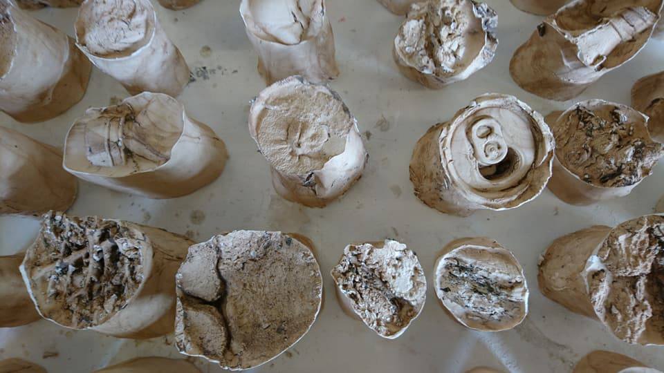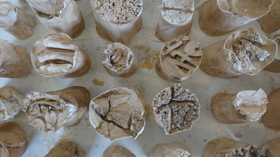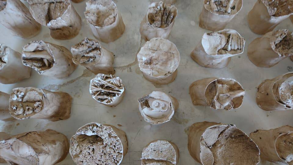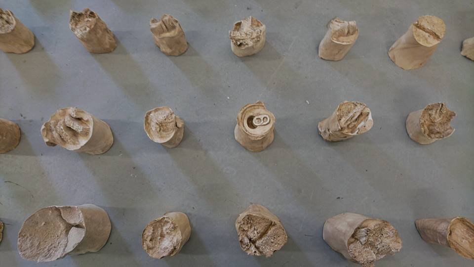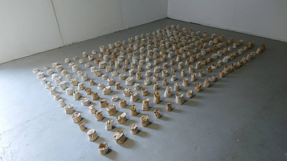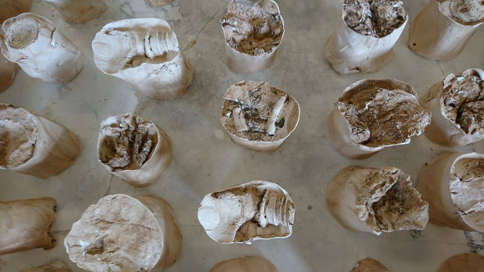 Installation, 240 elements, plaster cast of organic and man made objects, plaster, beeswax, terracotta clay