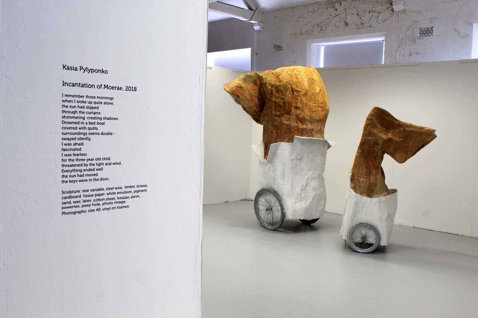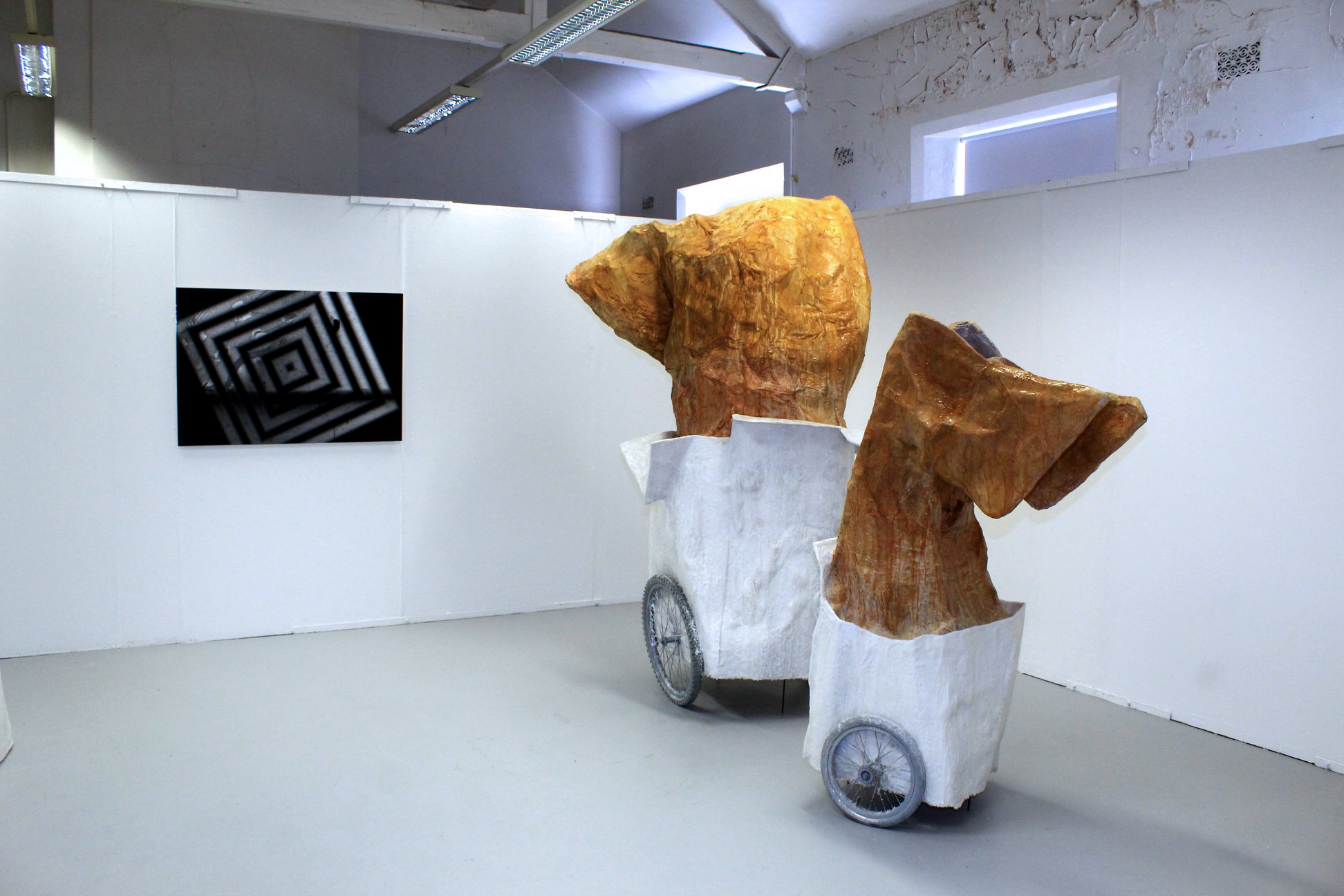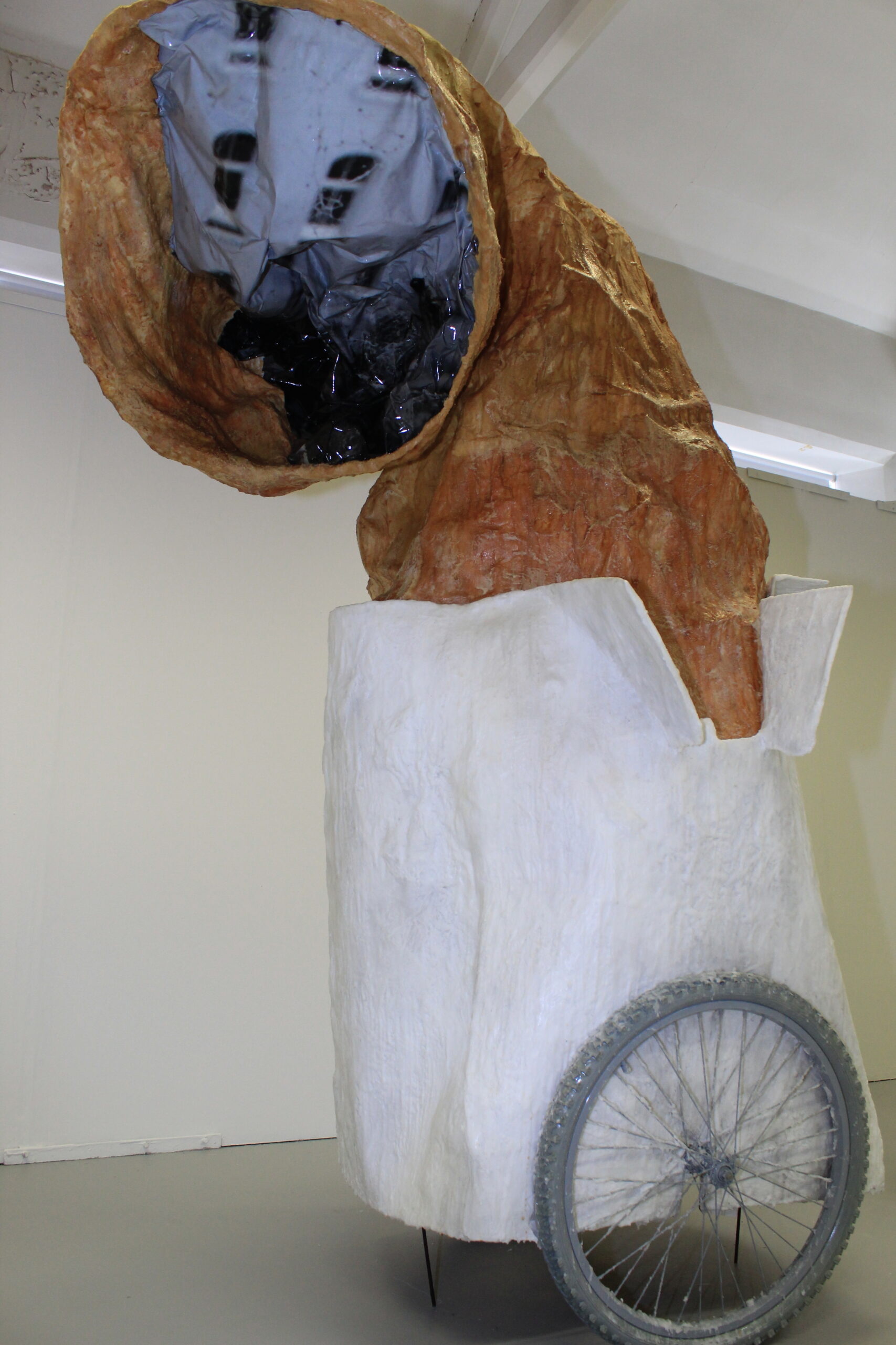 Sculpture, dimensions 3.2m, 2.8m, 2.6m, wax, latex, bicicle wheels, paper, vinyl, peepholes,